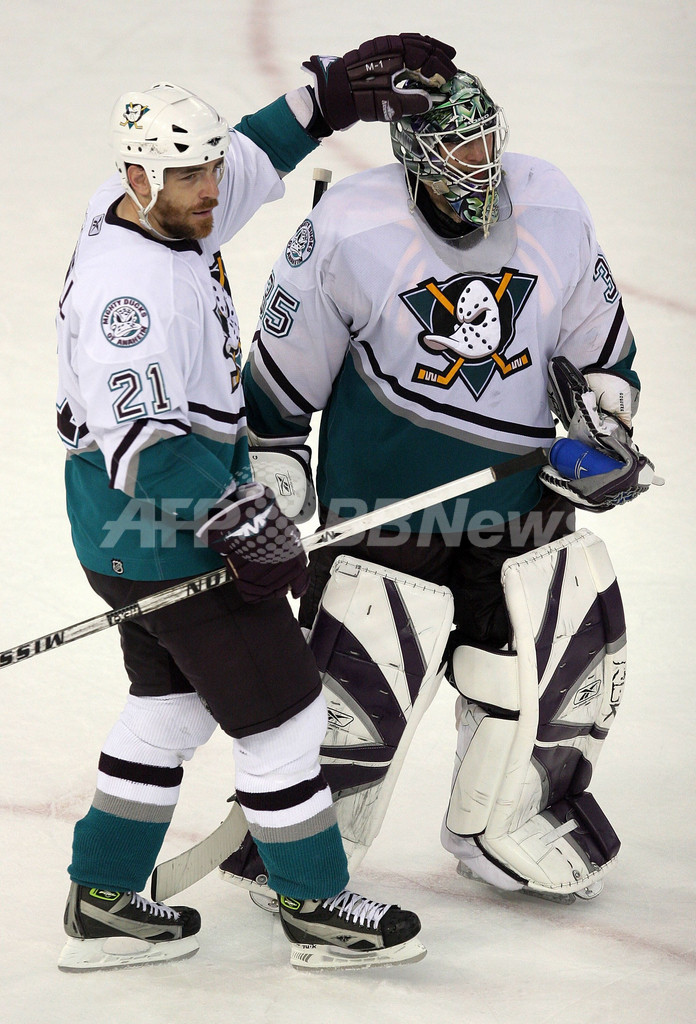 【エドモントン/カナダ 25日 AFP】NHL・プレーオフ、西カンファレンス決勝・第4戦、マイティダックス・オブ・アナハイム(Mighty Ducks of Anaheim)vsエドモントン・オイラーズ(Edmonton Oilers)。マイティダックスのショーン・オドネル(Sean O’Donnell、左)は、試合に勝利してこの日10試合振りに先発出場したゴーリー、ジャン・セバスチャン・ジゲーレ(Jean-Sebastien Giguere、右)と喜び合う。試合はマイティダックスが6-3でシリーズ初勝利を収め、対戦成績を1勝3敗とした。(c)AFP/Getty Images Tim Smith
