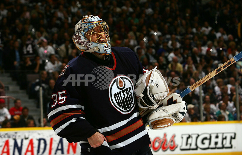 【エドモントン/カナダ 25日 AFP】NHL・プレーオフ、西カンファレンス決勝・第4戦、マイティダックス・オブ・アナハイム(Mighty Ducks of Anaheim)vsエドモントン・オイラーズ(Edmonton Oilers)。マイティダックスのショーン・オドネル(Sean O’Donnell、左)は、試合に勝利してこの日10試合振りに先発出場したゴーリー、ジャン・セバスチャン・ジゲーレ(Jean-Sebastien Giguere、右)と喜び合う。試合はマイティダックスが6-3でシリーズ初勝利を収め、対戦成績を1勝3敗とした。(c)AFP/Getty Images Tim Smith