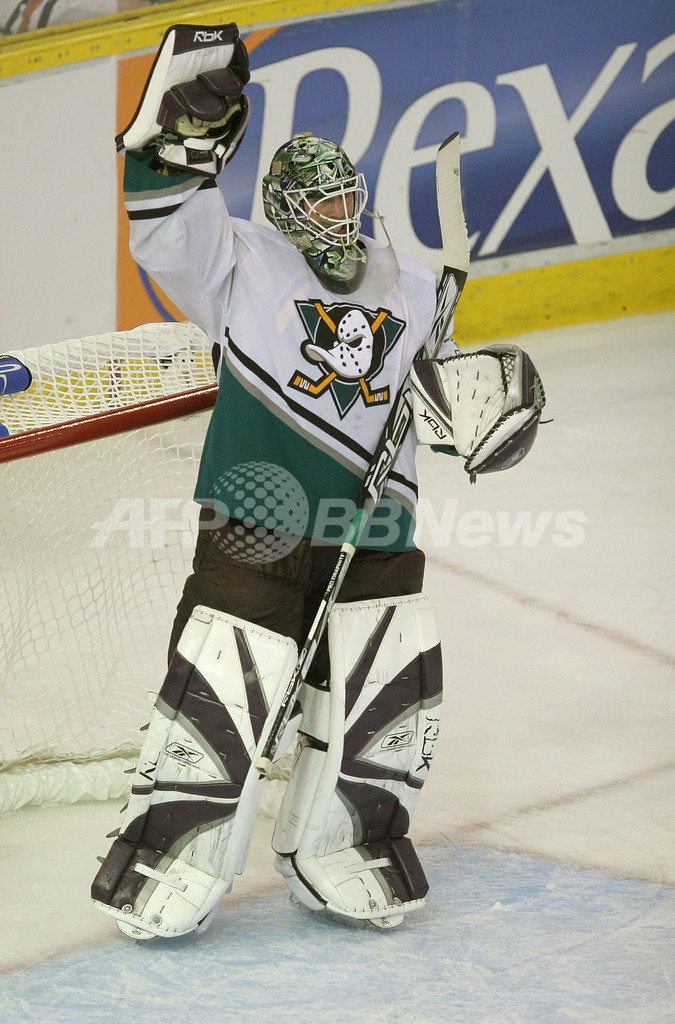 【エドモントン/カナダ 25日 AFP】NHL・プレーオフ、西カンファレンス決勝・第4戦、マイティダックス・オブ・アナハイム(Mighty Ducks of Anaheim)vsエドモントン・オイラーズ(Edmonton Oilers)。マイティダックスのショーン・オドネル(Sean O’Donnell、左)は、試合に勝利してこの日10試合振りに先発出場したゴーリー、ジャン・セバスチャン・ジゲーレ(Jean-Sebastien Giguere、右)と喜び合う。試合はマイティダックスが6-3でシリーズ初勝利を収め、対戦成績を1勝3敗とした。(c)AFP/Getty Images Tim Smith