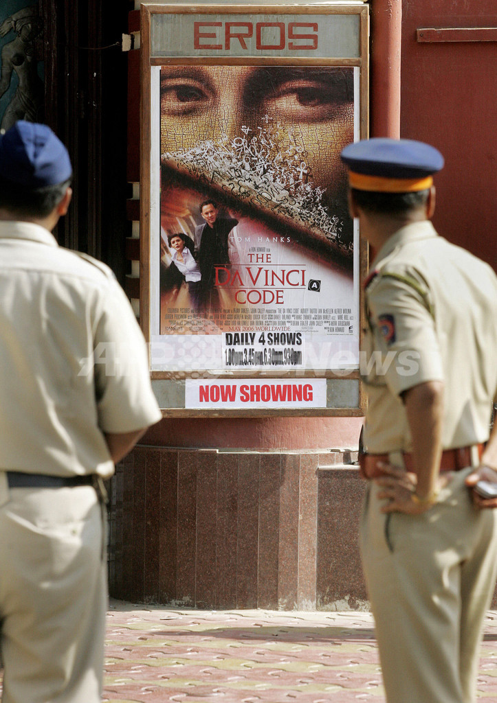 【ムンバイ/インド 27日 AFP】映画「ダ・ヴィンチ・コード」(Da Vinci Code)の上映が26日に開始された。同作品は成人向けにノーカット版で上映されるが、上映前と上映後にこの作品がフィクションであることを追加説明している。5月19日に上映が開始される予定だったが、キリスト教徒から追加説明を加えるようにとの強い申し立てを受け、配給会社であるソニー(Sony)との間の論争が長引き上映が遅れた。写真は映画館周辺で見張りをする警察官。(c)AFP/Sebastian D’SOUZA