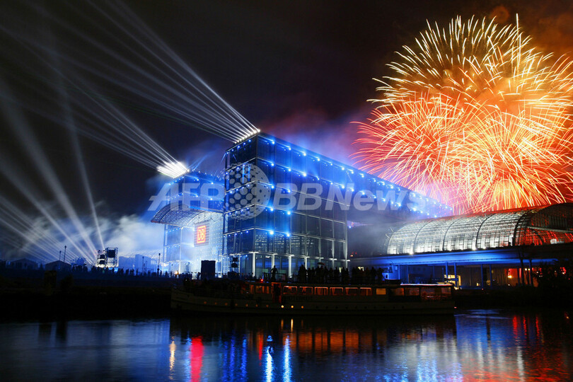 【ベルリン/ドイツ 27日 AFP】06サッカーW杯の開催を目前に控えた26日、ベルリン中央駅(Hauptbahnhof)が開業した。欧州最大となるこの新駅の建設は、東西ドイツ統一直後に計画が開始され、11年前からシュプレー(Spree)川と官庁街の地下を通る全長3.6キロメートルのトンネル工事に着工、8年前から本格的な建設工事が開始されていた。写真はシュプレー川沿いで開催された完成記念式典で、ベルリン中央駅の上空に打ち上げられた花火。(c)AFP/JOHANNES EISELE