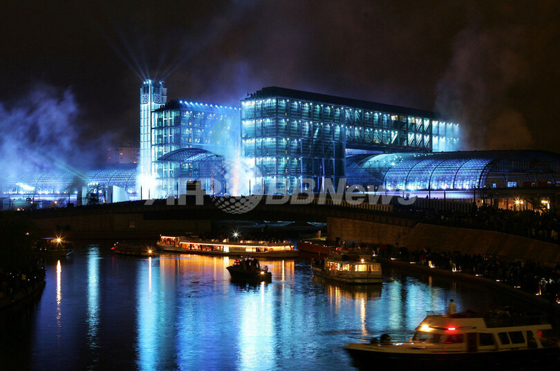 【ベルリン/ドイツ 27日 AFP】06サッカーW杯の開催を目前に控えた26日、ベルリン中央駅(Hauptbahnhof)が開業した。欧州最大となるこの新駅の建設は、東西ドイツ統一直後に計画が開始され、11年前からシュプレー(Spree)川と官庁街の地下を通る全長3.6キロメートルのトンネル工事に着工、8年前から本格的な建設工事が開始されていた。写真はシュプレー川沿いで開催された完成記念式典で、ベルリン中央駅の上空に打ち上げられた花火。(c)AFP/JOHANNES EISELE