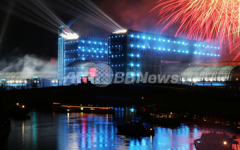 【ベルリン/ドイツ 27日 AFP】06サッカーW杯の開催を目前に控えた26日、ベルリン中央駅(Hauptbahnhof)が開業した。欧州最大となるこの新駅の建設は、東西ドイツ統一直後に計画が開始され、11年前からシュプレー(Spree)川と官庁街の地下を通る全長3.6キロメートルのトンネル工事に着工、8年前から本格的な建設工事が開始されていた。写真はシュプレー川沿いで開催された完成記念式典で、ベルリン中央駅の上空に打ち上げられた花火。(c)AFP/JOHANNES EISELE