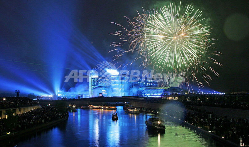 【ベルリン/ドイツ 27日 AFP】06サッカーW杯の開催を目前に控えた26日、ベルリン中央駅(Hauptbahnhof)が開業した。欧州最大となるこの新駅の建設は、東西ドイツ統一直後に計画が開始され、11年前からシュプレー(Spree)川と官庁街の地下を通る全長3.6キロメートルのトンネル工事に着工、8年前から本格的な建設工事が開始されていた。写真はシュプレー川沿いで開催された完成記念式典で、ベルリン中央駅の上空に打ち上げられた花火。(c)AFP/JOHANNES EISELE