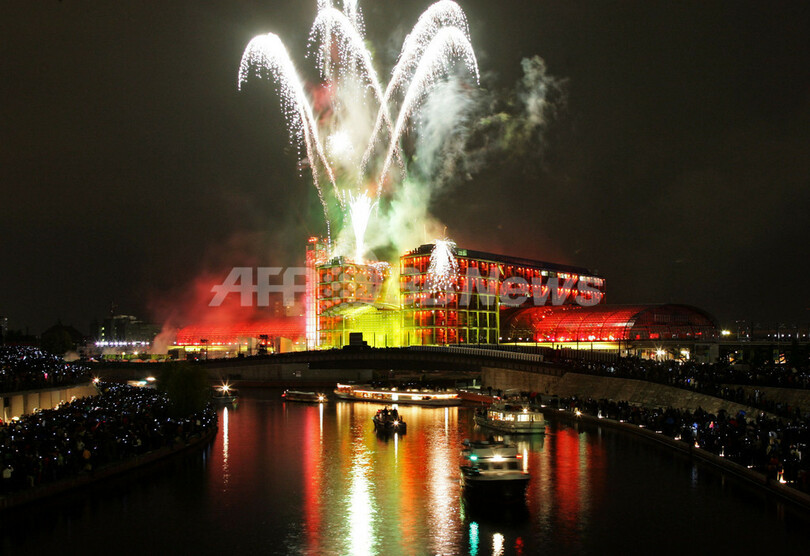 【ベルリン/ドイツ 27日 AFP】06サッカーW杯の開催を目前に控えた26日、ベルリン中央駅(Hauptbahnhof)が開業した。欧州最大となるこの新駅の建設は、東西ドイツ統一直後に計画が開始され、11年前からシュプレー(Spree)川と官庁街の地下を通る全長3.6キロメートルのトンネル工事に着工、8年前から本格的な建設工事が開始されていた。写真はシュプレー川沿いで開催された完成記念式典で、ベルリン中央駅の上空に打ち上げられた花火。(c)AFP/JOHANNES EISELE