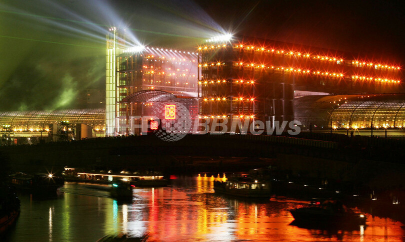 【ベルリン/ドイツ 27日 AFP】06サッカーW杯の開催を目前に控えた26日、ベルリン中央駅(Hauptbahnhof)が開業した。欧州最大となるこの新駅の建設は、東西ドイツ統一直後に計画が開始され、11年前からシュプレー(Spree)川と官庁街の地下を通る全長3.6キロメートルのトンネル工事に着工、8年前から本格的な建設工事が開始されていた。写真はシュプレー川沿いで開催された完成記念式典で、ベルリン中央駅の上空に打ち上げられた花火。(c)AFP/JOHANNES EISELE