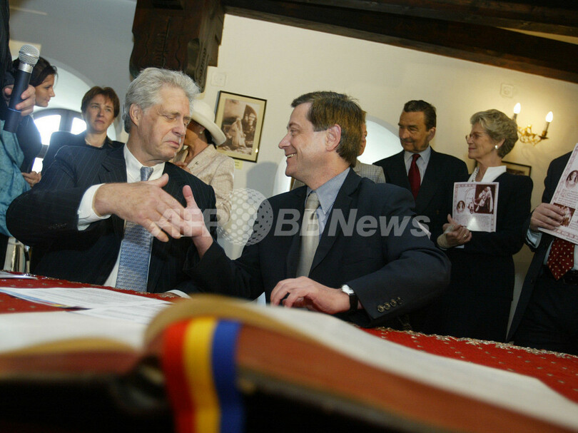 【ブラン/ルーマニア 27日 AFP】ニューヨーク在住の建築家ドミニク・フォン・ハプスブルグ氏(Dominic Von Habsburg)が26日、ドラキュラ城として知られる「ブラン城(Bran Castle)」の返還式に出席した。同氏は、17世紀後半から60年以上ルーマニアを支配したハプスブルグ王家の末裔で、イリアナ王女(Princess Ileana)の息子である。共産党政権により没収されていたドラキュラ伝説により国内で最も人気のある観光地である同城は、同政権の崩壊後、政府により同氏に返還されることになった。約2500万ドル(約28億円)の価値が予想される同城は1938年にメアリー女王(Queen Marie)から娘のイリアナ王女に遺贈された後、1948年に共産党員により没収されてから荒廃していた。写真は会見に出席したドミニク・フォン・ハプスブルグ氏。(c)AFP/DANIEL MIHAILESCU
