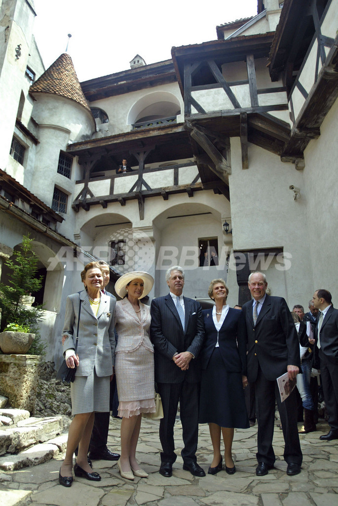 【ブラン/ルーマニア 27日 AFP】ニューヨーク在住の建築家ドミニク・フォン・ハプスブルグ氏(Dominic Von Habsburg)が26日、ドラキュラ城として知られる「ブラン城(Bran Castle)」の返還式に出席した。同氏は、17世紀後半から60年以上ルーマニアを支配したハプスブルグ王家の末裔で、イリアナ王女(Princess Ileana)の息子である。共産党政権により没収されていたドラキュラ伝説により国内で最も人気のある観光地である同城は、同政権の崩壊後、政府により同氏に返還されることになった。約2500万ドル(約28億円)の価値が予想される同城は1938年にメアリー女王(Queen Marie)から娘のイリアナ王女に遺贈された後、1948年に共産党員により没収されてから荒廃していた。写真は会見に出席したドミニク・フォン・ハプスブルグ氏。(c)AFP/DANIEL MIHAILESCU