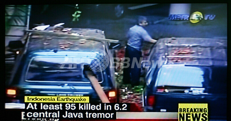 【ジョクジャカルタ/インドネシア 27日 AFP】27日、インドネシア中部ジャワ島南岸の人口密集地を大きな地震が襲い、少なくとも115人が死亡したと病院職員が伝えた。写真は27日に放送された、ジョクジャカルタ(Jokjakarta)の地震で損傷した車両。(c)AFP