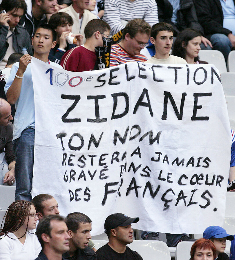 【サンドニ/フランス 27日 AFP】サッカー・親善試合、フランスvsメキシコ。前半45分に先制ゴールを奪ったフランスのフローラン・マルーダ(Florent Malouda、中)はチームメイトのジネディーヌ・ジダン(Zinedine Zidane、左)、パトリック・ビエラ(Patrick Vieira、右2)、ダビド・トレゼゲ(David Trezeguet、右)から祝福を受ける。試合はこれが決勝点となりフランスが1-0でメキシコに勝利した。6月9日に開幕する06サッカーW杯に出場するフランスはグループGでスイス、韓国、トーゴと対戦、グループDに所属するメキシコはイラン、アンゴラ、ポルトガルと対戦する。(c)AFP/PASCAL PAVANI