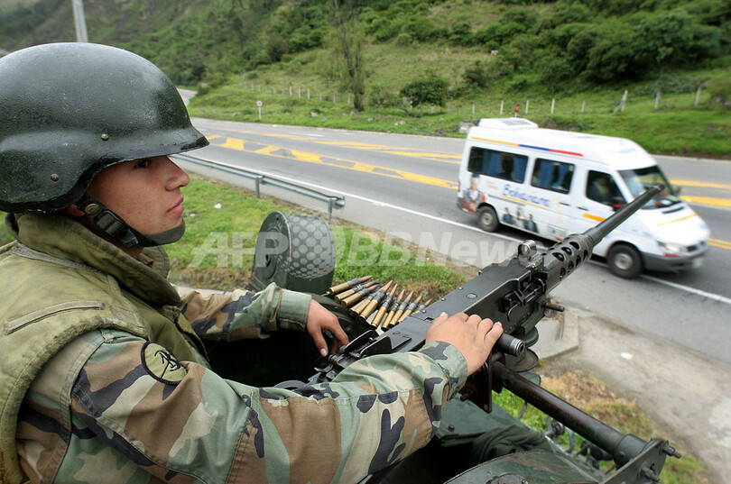 【Ubaque/コロンビア 28日 AFP】コロンビアで28日に行われる大統領選挙で、現職の保守派アルバロ・ウリベ(Alvaro Uribe)大統領が再選される見通しが高まった。犯罪や暴動対策の経験を生かし2期目を務める。弁護士で米国で教育を受けたウリベ大統領は、3回におよぶ世論調査では平均57.5%の支持率で、3回とも決選投票なしで大統領に選出されるために必要な過半数を超えた。2番手は支持率21%の左派の民主改革党のカルロス・ガビリア(Carlos Gaviria)上院議員、3番手は支持率がかろうじて12%を上回っている自由党(Liberal Party)のオラシオ・セルパ(Horacio Serpa)候補で、両者ともウリベ大統領から大きく引き離されている。写真はボゴタ(Bogota)から56キロメートルのUbaque郊外で、選挙の治安対策のために見張りをする兵士。(c)AFP/Rodrigo BUENDIA