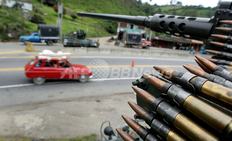 【Ubaque/コロンビア 28日 AFP】コロンビアで28日に行われる大統領選挙で、現職の保守派アルバロ・ウリベ(Alvaro Uribe)大統領が再選される見通しが高まった。犯罪や暴動対策の経験を生かし2期目を務める。弁護士で米国で教育を受けたウリベ大統領は、3回におよぶ世論調査では平均57.5%の支持率で、3回とも決選投票なしで大統領に選出されるために必要な過半数を超えた。2番手は支持率21%の左派の民主改革党のカルロス・ガビリア(Carlos Gaviria)上院議員、3番手は支持率がかろうじて12%を上回っている自由党(Liberal Party)のオラシオ・セルパ(Horacio Serpa)候補で、両者ともウリベ大統領から大きく引き離されている。写真はボゴタ(Bogota)から56キロメートルのUbaque郊外で、選挙の治安対策のために見張りをする兵士。(c)AFP/Rodrigo BUENDIA