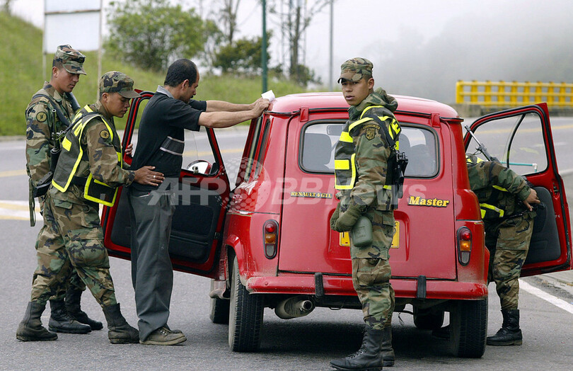 【Ubaque/コロンビア 28日 AFP】コロンビアで28日に行われる大統領選挙で、現職の保守派アルバロ・ウリベ(Alvaro Uribe)大統領が再選される見通しが高まった。犯罪や暴動対策の経験を生かし2期目を務める。弁護士で米国で教育を受けたウリベ大統領は、3回におよぶ世論調査では平均57.5%の支持率で、3回とも決選投票なしで大統領に選出されるために必要な過半数を超えた。2番手は支持率21%の左派の民主改革党のカルロス・ガビリア(Carlos Gaviria)上院議員、3番手は支持率がかろうじて12%を上回っている自由党(Liberal Party)のオラシオ・セルパ(Horacio Serpa)候補で、両者ともウリベ大統領から大きく引き離されている。写真はボゴタ(Bogota)から56キロメートルのUbaque郊外で、選挙の治安対策のために見張りをする兵士。(c)AFP/Rodrigo BUENDIA
