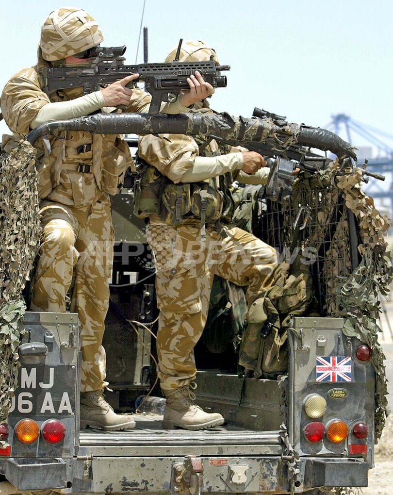 【ウムカスル/イラク 28日 AFP】バグダッド南のウムカスル(Umm Qasr)港をイラク復興管理室(Iraq Reconstruction Management Office, IRMO)のDaniel Speckhard米大使が訪問した。ウムカスル港は、戦争の傷跡が深いイラクに必要な多くの人道支援物資を供給するための生命線として考えられている。写真は27日、ウムカスル港の外に駐車中の英国陸軍ジープのスペアタイヤに結ばれたラクダのぬいぐるみ。(c)AFP/ALI AL-SAADI