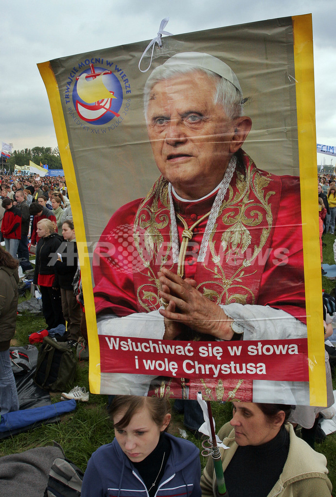 【クラクフ/ポーランド 28日 AFP】4日間の日程でポーランド訪問中のローマ法王ベネディクト16世(Pope Benedict XVI)は27日、クラクフ(Krakow)に到着した。ポーランド滞在中、前法王ヨハネ・パウロ2世(John Paul II)のゆかりの地や、旧ナチスの強制収容所跡があるアウシュビッツ・ビルケナウ(Auschwitz-Birkenau)も訪れる。写真はクラクフのヴァヴェル(Wawel)城へ向かうベネディクト16世を沿道で待つ巡礼者。(c)AFP/JOE KLAMAR