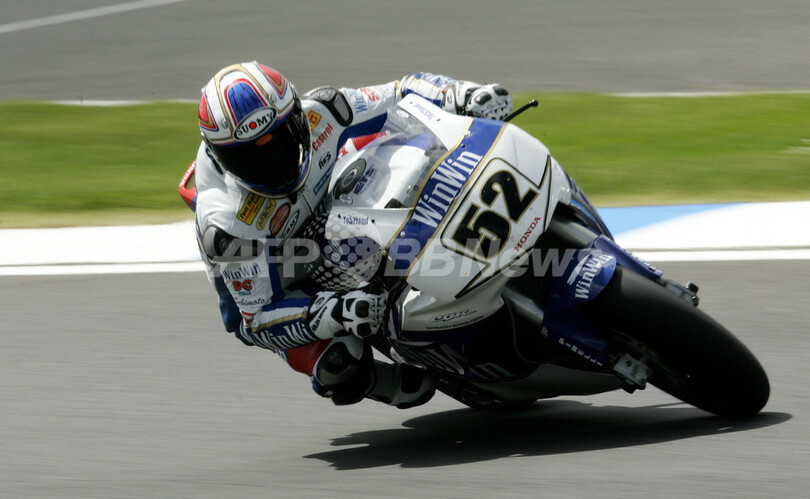 【ノーサンプトン/英国 28日 AFP】スーパーバイク世界選手権(Superbike World Championship)・第5戦シルバーストーンGP、レース1・決勝。ドゥカティ・ゼロックス・チーム(Ducati Xerox Team)のトロイ・ベイリス(Troy Bayliss)は、レース1で40分49秒894をマークし優勝、レース2も40分42秒003のタイムで優勝を収めた。写真は笑顔で表彰台に上るベイリス。(c)AFP/CARL DE SOUZA