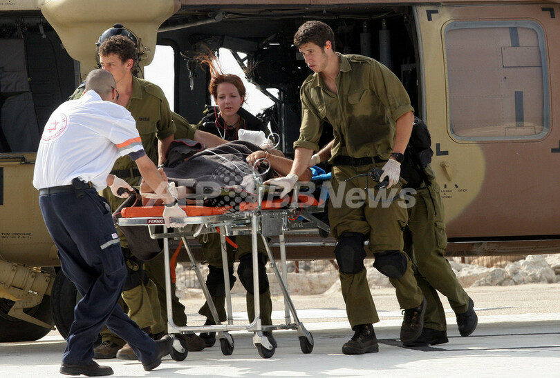【ハイファ/イスラエル 29日 AFP】イスラエルは28日、同国領内へのロケット弾攻撃に対する報復措置として、レバノンの複数の軍事目標を空爆した。武装兵2人が死亡し、両国間の緊張が高まっている。越境攻撃の続くイスラエル北部の都市キリヤットシュモナ(Kiryat Shmona)とナハリヤ(Nahariya)では、全住民に避難勧告が出された。イスラエル側はこれらの攻撃をイスラム系過激派組織ヒズボラ(Hezbollah)によるものと非難している。写真は沿岸の都市ハイファ(Haifa)の病院にヘリコプターで搬送されたイスラエル軍の負傷兵。(c)AFP/RONI SCHUTZER