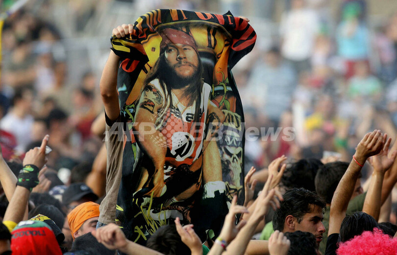 【リスボン/ポルトガル 28日 AFP】5月26日、27日と6月2日、3日、4日に渡り開催される1985年から続く一大音楽フェスティバルのロック・イン・リオ(Rock in Rio)のワールド・ステージ(World Stage)で27日、イギリスのバンド、ダークネス(The Darkness)がパフォーマンスを行った。写真は同バンドのヴォーカル、ジャスティン・ホーキンス(Justin Hawkins)。(c)AFP/JORGE PADEIRO