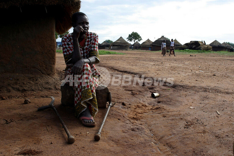 【ジュバ/スーダン 29日 AFP】スーダン南部での内戦のため、1400人の人々が75マイル離れたジュバ(Juba)の国内難民キャンプに非難した。21年間続いたこの内戦は2005年1月に和平協定により停戦したが、内戦による国内難民の数は450万人にものぼるという。写真は24日、国内難民キャンプの小屋の前で座り込むAngelica Kitaliさん。Kitaliさんは2002年7月に、神の抵抗軍(Lord’s Resistance Army, LRA)の攻撃で左足を失った。(c)AFP/TUGELA RIDLEY