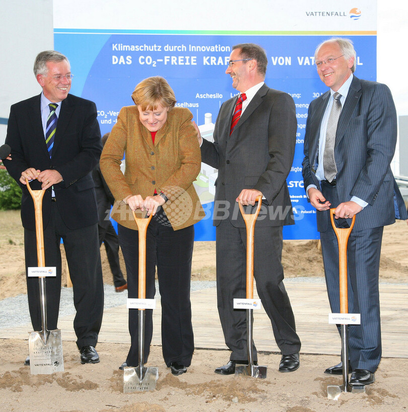 【シュヴァルツェ・プンペ/ドイツ 30日 AFP】独電力会社ヴァッテンファル・ヨーロッパ(Vattenfall Europe)は29日、二酸化炭素の化学吸収法を採用した世界初の低公害火力発電所を建設を開始した。建設地はドイツ東部のシュヴァルツェ・プンペ(Schwarze Pumpe)で、2008年に運転開始予定。写真は29日、同発電所の起工式で最初のシャベルを入れるアンゲラ・メルケル(Angela Merkel)独首相(左から二人目)と、それを見るMatthias Platzeckブランデンブルク(Brandenburg)州知事(右から二人目)、Lars Josefssonヴァッテンファル会長(右)、およびKlaus Rauscherヴァッテンファル・ヨーロッパ会長(左)。(c)AFP/MICHAEL URBAN