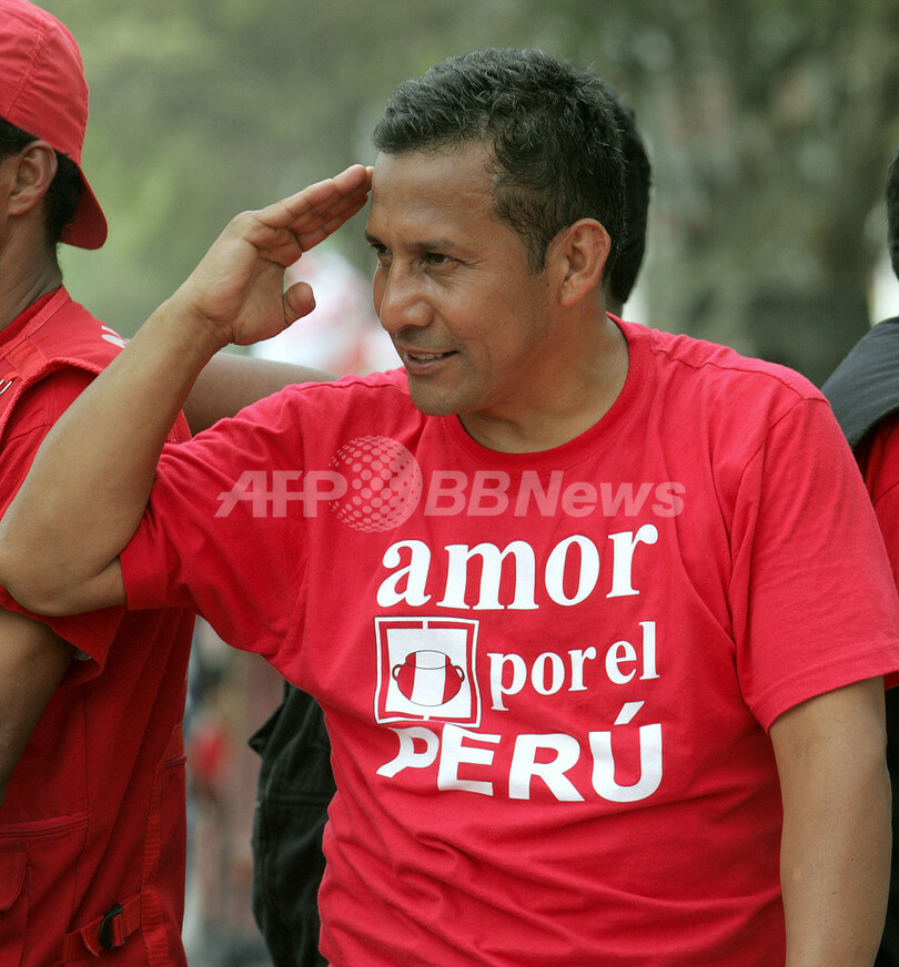 【ピウラ/ペルー 30日 AFP】ペルーの大統領選挙は6月4日、「ペルーのための連合(Union for Peru)」のオジャンタ・ウマラ(Ollanta Humala)候補と社会民主系「アメリカ革命人民同盟党(APRA)」のアラン・ガルシア(Alan Garcia)候補との間で決戦投票が行われる。写真は29日、リマ(Lima)の北約1000キロのピウラ(Piura)での集会で、支持者に敬礼するウマラ候補。(c)AFP/Eitan ABRAMOVICH
