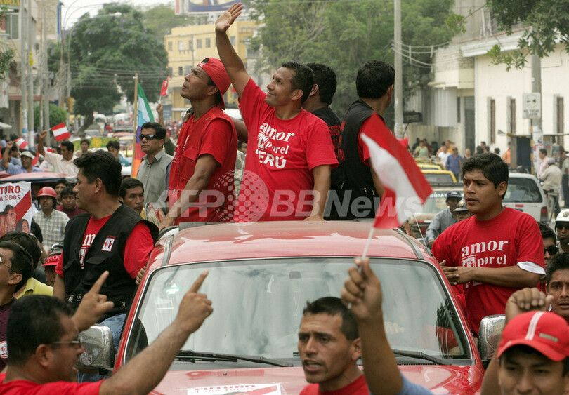 【ピウラ/ペルー 30日 AFP】ペルーの大統領選挙は6月4日、「ペルーのための連合(Union for Peru)」のオジャンタ・ウマラ(Ollanta Humala)候補と社会民主系「アメリカ革命人民同盟党(APRA)」のアラン・ガルシア(Alan Garcia)候補との間で決戦投票が行われる。写真は29日、リマ(Lima)の北約1000キロのピウラ(Piura)での集会で、支持者に敬礼するウマラ候補。(c)AFP/Eitan ABRAMOVICH