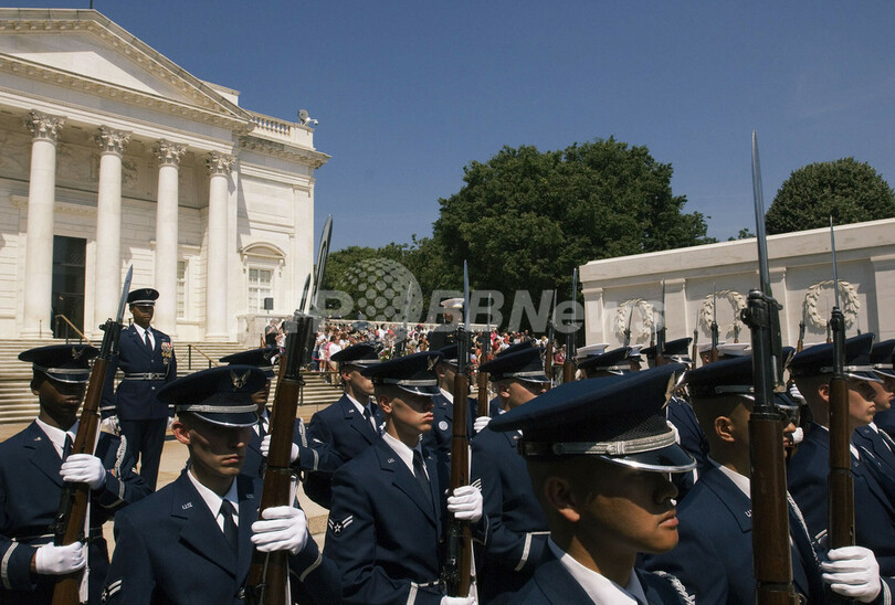【アーリントン/米国 30日 AFP】「戦没将兵追悼記念日(Memorial Day)」の29日、バージニア州アーリントン(Arlington)で記念式典が行われ、ジョージ・W・ブッシュ(George W. Bush)大統領がアーリントン国立墓地(Arlington National Cemetery)の無名戦士の墓に献花した。写真は、献花後に敬礼するブッシュ大統領と、連邦本部およびUS Army Military District of Washingtonの司令官Guy C. Swan III(右)。(c)AFP/Mandel NGAN