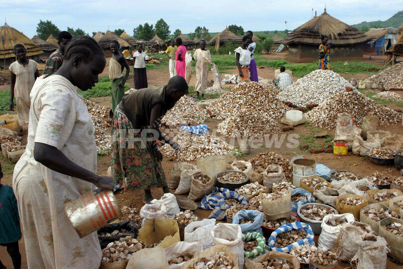 【ジュバ/スーダン 29日 AFP】スーダン南部の国内難民キャンプでは、砕石が数少ない仕事の1つになっている。砕いた石は建設用の砂利として使用され、ジェリー缶1杯分で100ディナール(60円以下)が支払われる。このわずかな収入で、難民キャンプの人々は毎日の食事をまかなっている。難民は、自分たちが耕した土地で作物が収穫されても、その土地が他人所有のものであるため、それを自分達で消費することはできない。写真は24日、ジュバ(Juba)のLobonokキャンプで砂利を缶に詰める難民たち。(c)AFP/TUGELA RODLEY