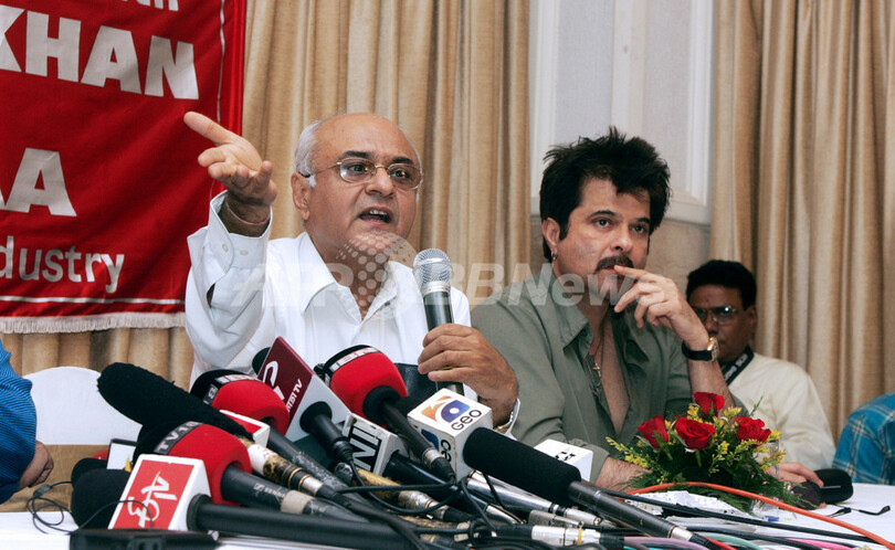 【ムンバイ/インド 30日 AFP】インド版ハリウッド、ボリウッドのスター俳優アーミル・カーン(Aamir Khan)の最新作「Fanaa」が、グジャラートで上映禁止となったことに関連した会見が29日に行われ、仲間であるアーミル・カーンを支持する俳優のアニル・カプール(Anil Kapoor、右)とインド映画・テレビ制作者組合(Film & Television Producers Guild of India、FTPGI)のアミット・カンナ会長(Amit Khanna、左)が出席した。巨大ダム、ナルマダ・ダム(Narmada Dam)工事により住居を奪わる人々に対する適切な支援をカーンが主張したことから、映画「Fanaa」は同地方の与党であるBJPに上映を禁止された。(c)AFP/Sebastian D’Souza