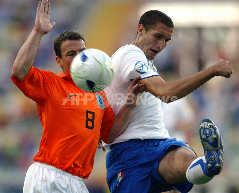 【アヴェイロ/ポルトガル 29日 AFP】サッカー、U-21・欧州選手権2006(UEFA Under 21 Championship 2006)・グループリーグB、オランダvsイタリア。オランダのロン・フラール(Ron Vlaar、右)は、イタリアのロランド・ビアンキ(Rolando Bianchi)とボールを競り合う。試合はオランダが1-0で勝利を収め、グループリーグ2位で準決勝進出を決めた。(c)AFP/Miguel RIOPA