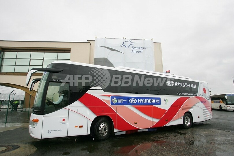 【フランクフルト/ドイツ 27日 AFP BB】6月9日から開幕する06サッカーW杯ドイツ大会に出場する日本代表選手は26日、フランクフルト(Frankfurt)国際空港に到着し、地元ファンの出迎えを受けた。その後、大会期間中のキャンプ地のボン(Bonn)へ移動した代表選手は、翌27日、数百人におよぶファンや報道陣に見守られながら全員揃って初練習を行った。ドイツ入り直前まで福島県のJヴィレッジで行われた合宿では、主として体力強化を行ってきたが、ボンでの練習は紅白戦を含めた実戦的な練習に切り替えている。日本代表W杯出場は今大会で3度目。30日のドイツ戦、6月4日のマルタ戦などの強化試合を経て、同12日に一次リーグ初戦のオーストラリア戦をカイザースラウテルン(Kaiserslautern)で行う予定。写真は日本選手団を乗せて、フランクフルト国際空港に到着した日航機。(c)AFP BB/Shinya Haga
