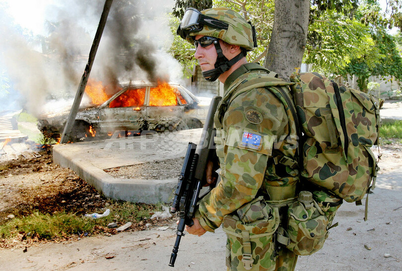 ニュース 戦争・紛争 散発的な衝突続く首都ディリ - 東ティモール 2006年5月30日 14:31 発信地:東ティモール [ アジア・オセアニア 東ティモール ] このニュースをシェア ‹ › ❮ 9/13 ❯ 写真はディリで30日、パトロール中に燃える車両の前を通過する豪軍兵士。(c)AFP/William WEST 画像作成中 ! 【ディリ/東ティモール 30日 AFP】首都ディリ(Dili)周辺では依然として武装集団による抗争が続いている。首都中心部と空港を結ぶ主要道路の東西から散発的な銃声が響いている。写真はディリで29日、武装集団の衝突により炎上する車両の横を通過する豪軍の装甲兵員輸送車(APC)。(c)AFP/William WEST 戦争・紛争 一覧へ> メディア・報道関係・法人の方向け 写真・動画 購入のお問合せ>
