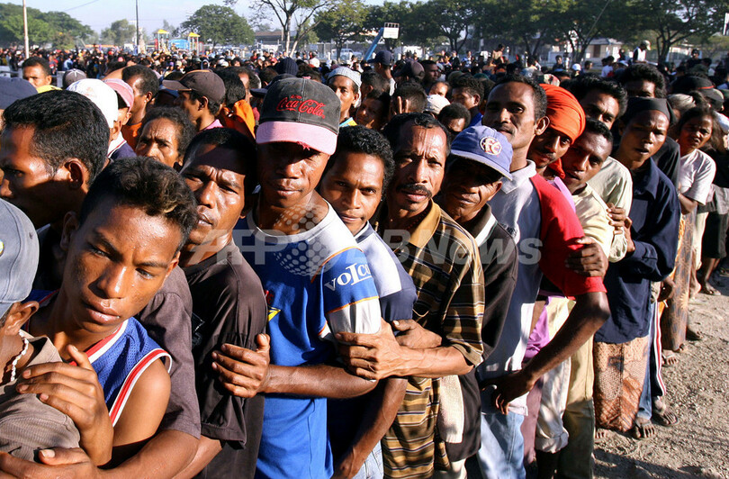【ディリ/東ティモール 30日 AFP】30日、首都ディリ(Dili)の大統領官邸近くでは、引き続き武装集団同士が衝突を起こし、数万人が家を捨て避難を余儀なくされている。同日、シャナナ・グスマン(Xanana Gusmao)大統領は、内戦化した同国の状態を正常に戻すため、官邸で危機回避を話し合う会合を開いた。住民の多くは必死で食料を求め、食糧の倉庫に長い列を作っている。写真はディリで30日、米の配給所に並ぶ数千人の地元住民。(c)AFP/William WEST