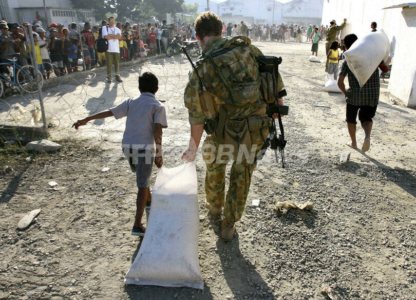 【ディリ/東ティモール 30日 AFP】30日、首都ディリ(Dili)の大統領官邸近くでは、引き続き武装集団同士が衝突を起こし、数万人が家を捨て避難を余儀なくされている。同日、シャナナ・グスマン(Xanana Gusmao)大統領は、内戦化した同国の状態を正常に戻すため、官邸で危機回避を話し合う会合を開いた。住民の多くは必死で食料を求め、食糧の倉庫に長い列を作っている。写真はディリで30日、米の配給所に並ぶ数千人の地元住民。(c)AFP/William WEST