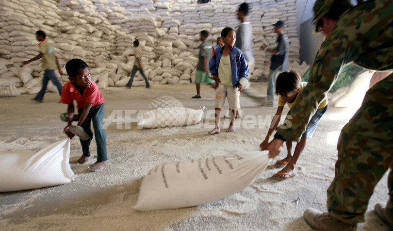 【ディリ/東ティモール 30日 AFP】30日、首都ディリ(Dili)の大統領官邸近くでは、引き続き武装集団同士が衝突を起こし、数万人が家を捨て避難を余儀なくされている。同日、シャナナ・グスマン(Xanana Gusmao)大統領は、内戦化した同国の状態を正常に戻すため、官邸で危機回避を話し合う会合を開いた。住民の多くは必死で食料を求め、食糧の倉庫に長い列を作っている。写真はディリで30日、米の配給所に並ぶ数千人の地元住民。(c)AFP/William WEST