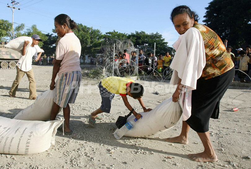 【ディリ/東ティモール 30日 AFP】30日、首都ディリ(Dili)の大統領官邸近くでは、引き続き武装集団同士が衝突を起こし、数万人が家を捨て避難を余儀なくされている。同日、シャナナ・グスマン(Xanana Gusmao)大統領は、内戦化した同国の状態を正常に戻すため、官邸で危機回避を話し合う会合を開いた。住民の多くは必死で食料を求め、食糧の倉庫に長い列を作っている。写真はディリで30日、米の配給所に並ぶ数千人の地元住民。(c)AFP/William WEST