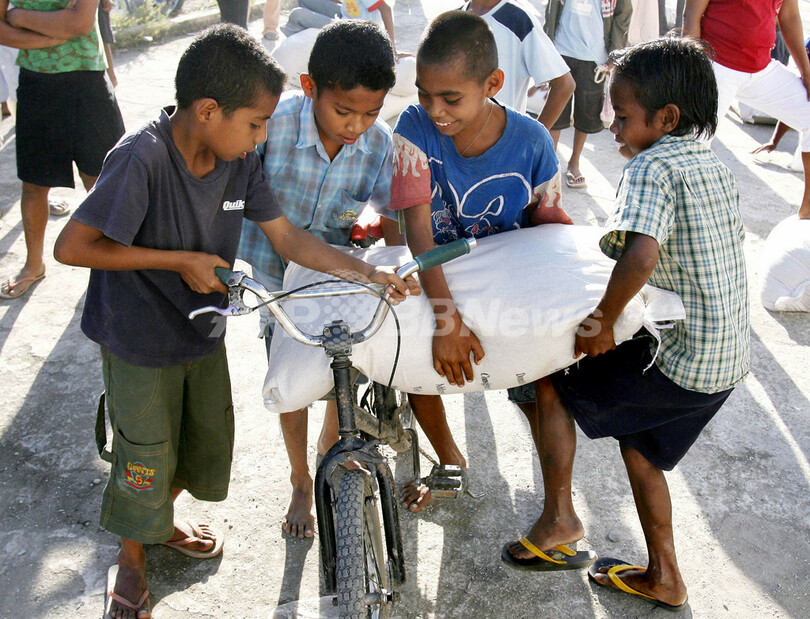 【ディリ/東ティモール 30日 AFP】30日、首都ディリ(Dili)の大統領官邸近くでは、引き続き武装集団同士が衝突を起こし、数万人が家を捨て避難を余儀なくされている。同日、シャナナ・グスマン(Xanana Gusmao)大統領は、内戦化した同国の状態を正常に戻すため、官邸で危機回避を話し合う会合を開いた。住民の多くは必死で食料を求め、食糧の倉庫に長い列を作っている。写真はディリで30日、米の配給所に並ぶ数千人の地元住民。(c)AFP/William WEST