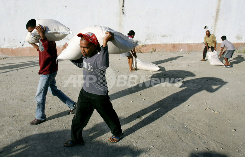 【ディリ/東ティモール 30日 AFP】30日、首都ディリ(Dili)の大統領官邸近くでは、引き続き武装集団同士が衝突を起こし、数万人が家を捨て避難を余儀なくされている。同日、シャナナ・グスマン(Xanana Gusmao)大統領は、内戦化した同国の状態を正常に戻すため、官邸で危機回避を話し合う会合を開いた。住民の多くは必死で食料を求め、食糧の倉庫に長い列を作っている。写真はディリで30日、米の配給所に並ぶ数千人の地元住民。(c)AFP/William WEST