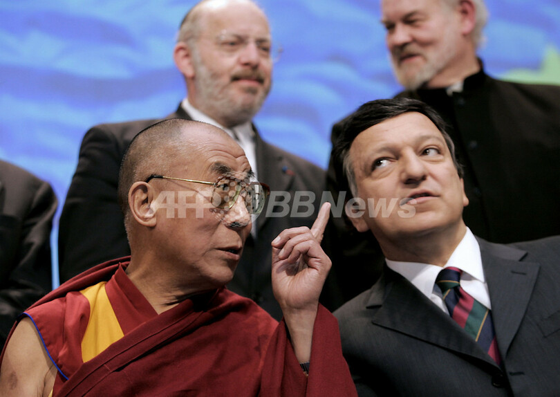 【ブリュッセル/ベルギー 30日 AFP】ブリュッセル(Brussels)の欧州連合(EU)本部で30日、宗教指導者を集めた基本権と相互尊重に関する会議が開催された。ジョゼ・マヌエル・バローゾ(Jose Manuel Barroso)EC委員長は、EU加盟25か国における保護貿易主義の懸念が高まる中、加盟国に対し「国家主義の誇張」を行わないよう警告した。写真は会議に出席するチベットの精神的指導者、ダライ・ラマ(Dalai Lama)14世とバローゾEC委員長(右)。(c)AFP/GERARD CERLES