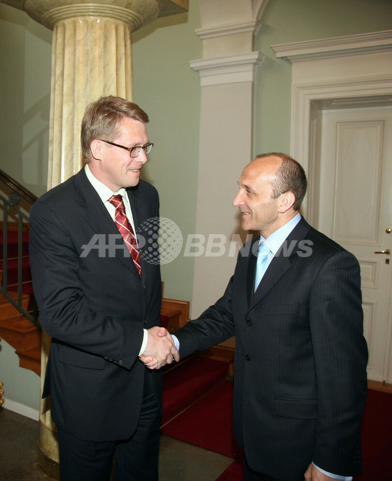 【ヘルシンキ/フィンランド 31日 AFP】ポーランドのカジミエジュ・マルチンキエウィチュ(Kazimierz Marcinkiewicz)首相は30日午後、フィンランドの首都ヘルシンキ(Helsinki)を訪問、マッティ・バンハネン(Matti Vanhanen)フィンランド首相とEU問題について協議した。フィンランドは、7月から欧州連合(EU)議長国となる。写真は、バンハネン首相(左)と握手を交わすマルチンキエウィチュ首相(右)。(c)AFP/Jussi Nukari