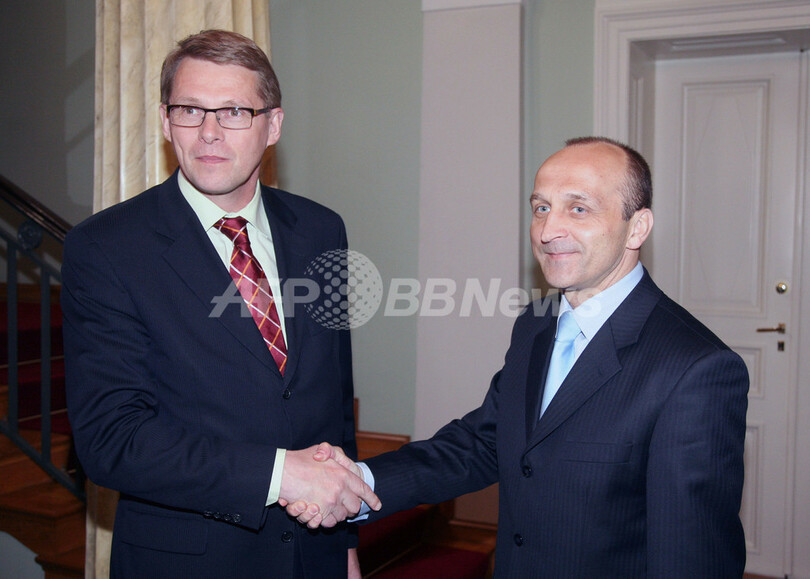 【ヘルシンキ/フィンランド 31日 AFP】ポーランドのカジミエジュ・マルチンキエウィチュ(Kazimierz Marcinkiewicz)首相は30日午後、フィンランドの首都ヘルシンキ(Helsinki)を訪問、マッティ・バンハネン(Matti Vanhanen)フィンランド首相とEU問題について協議した。フィンランドは、7月から欧州連合(EU)議長国となる。写真は、バンハネン首相(左)と握手を交わすマルチンキエウィチュ首相(右)。(c)AFP/Jussi Nukari