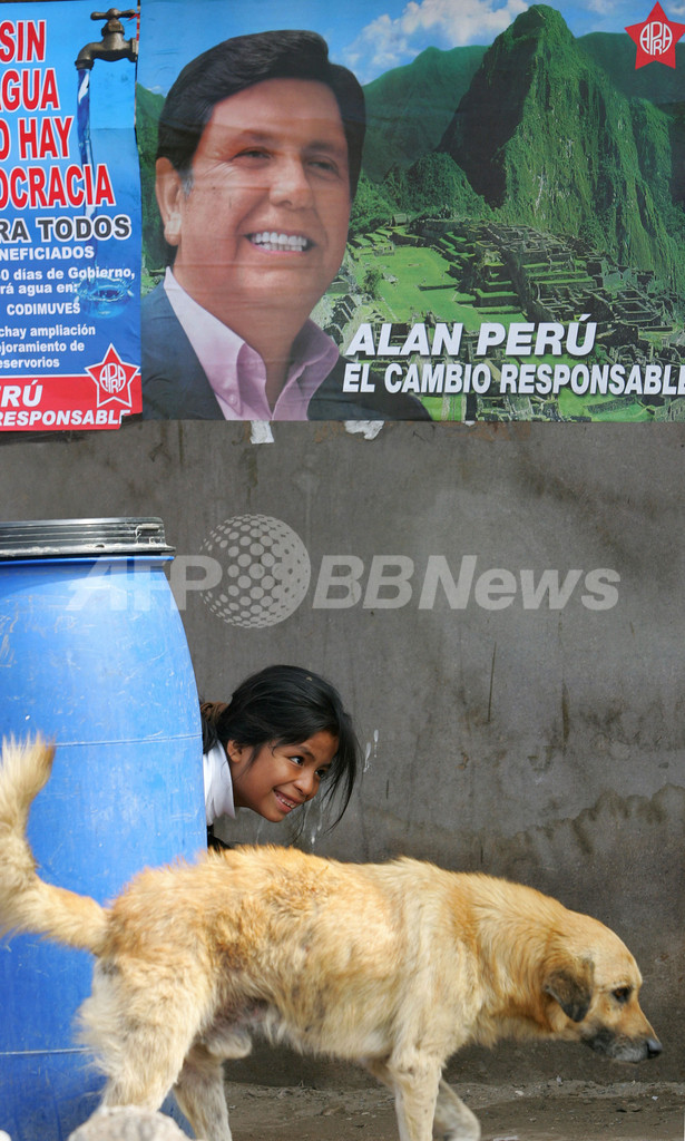 ニュース 政治・経済 <ペルー大統領選挙>決選投票近づく - ペルー 2006年5月31日 3:55 発信地:ペルー [ 中南米 ペルー ] このニュースをシェア ‹ › ❮ 4/6 ❯ 写真はリマで30日、ガルシア候補のポスターのそばで犬と遊ぶ少女。(c)AFP/MARTIN BERNETTI 画像作成中 ! 【リマ/ペルー 31日 AFP】6月4日に行われる大統領選挙の決選投票では、元大統領でアメリカ革命人民同盟(APRA)のアラン・ガルシア(Alan Garcia)候補とペルーのための連合(Union for Peru)のオジャンタ・ウマラ(Ollanta Humala)候補が対決する。写真はリマで30日、ガルシア候補のポスターの前を歩く男性。(c)AFP/MARTIN BERNETTI 政治・経済 一覧へ> メディア・報道関係・法人の方向け 写真・動画 購入のお問合せ>
