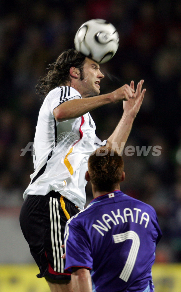 【レバークーゼン/ドイツ 30日 AFP】サッカー・親善試合、ドイツvs日本。日本の高原直泰(Naohiro Takahara)は、後半20分にこの日自身2点目の得点をゴール左隅に決める。しかしその後はドイツに巻き返しされ、2-2の同点で引き分けた。6月9日から開催される06サッカーW杯のグループFに所属する日本はブラジル、クロアチア、オーストラリアと対戦する。(c)AFP/TOSHIFUMI KITAMURA