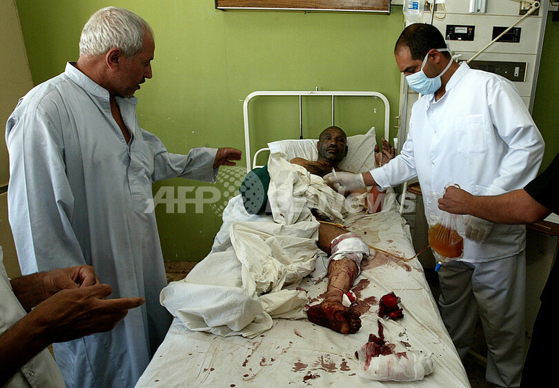 【バグダッド/イラク 31日 AFP】バグダッド北東部の都市フセイニヤ(Husseiniya)で30日、混み合った夕暮れ時の市場で車に仕掛けられた爆弾が爆発し、巻き込まれた市民22人が犠牲になった。また、イラク内務省当局者によると、拷問を受け頭を撃ち抜かれた遺体がイラク各地で少なくとも40体見つかっている。最も多く犠牲者を出したのはバグダッド東部のバラディヤト(Baladiyat)で16人の遺体が確認された。写真は31日、市場での爆発で負傷し、バグダッドの病院で治療を受ける市民。(c)AFP/WISAM SAMI