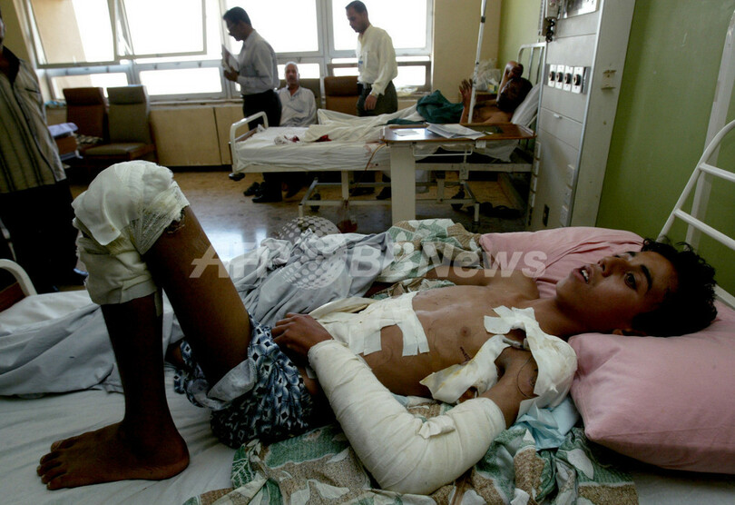 【バグダッド/イラク 31日 AFP】バグダッド北東部の都市フセイニヤ(Husseiniya)で30日、混み合った夕暮れ時の市場で車に仕掛けられた爆弾が爆発し、巻き込まれた市民22人が犠牲になった。また、イラク内務省当局者によると、拷問を受け頭を撃ち抜かれた遺体がイラク各地で少なくとも40体見つかっている。最も多く犠牲者を出したのはバグダッド東部のバラディヤト(Baladiyat)で16人の遺体が確認された。写真は31日、市場での爆発で負傷し、バグダッドの病院で治療を受ける市民。(c)AFP/WISAM SAMI