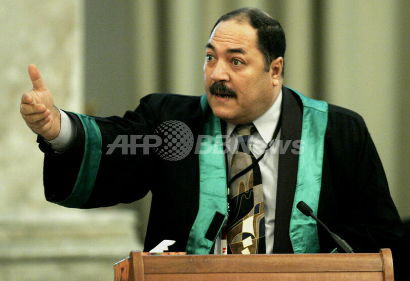 【バグダッド/イラク 31日 AFP】人道に対する罪で他の7人と共に起訴されているサダム・フセイン(Saddam Hussein)元大統領の裁判が31日、バグダッド中心部の米軍管理区域、通称グリーンゾーン(Green Zone)で再開された。法廷で放映された映像には、問題となっている村で主任検察官ムサウィ(Mussawi)氏が映っているとされるが、前日ドバイ(Dubai)の衛星テレビ、アルアラビア(Al-Arabiya)が放映した映像と同じものと見られる。またムサウィ氏本人は映像の中の人物が自分であることを否定している。写真は31日、法廷で裁判官に語りかける被告側弁護人。(c)AFP/ERIK DE CASTRO