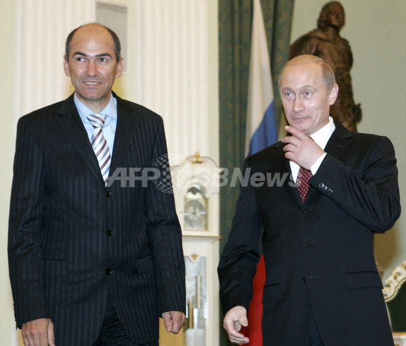 【モスクワ/ロシア 31日 AFP】3日間の日程でロシアを公式訪問中のスロベニアのヤネズ・ヤンシャ(Janez Jansa)首相は31日、ウラジーミル・プーチン(Vladimir Putin)大統領と、モスクワのクレムリン(Kremlin)宮殿で会談した。ヤンシャ首相は、31日のコメルサント(Kommersant)紙のインタビューに対し、ガス供給に関するロシア-欧州連合(EU)間のエネルギー協定についてスロベニアは支持の立場だと語った。写真は会談を終え、握手を交わすプーチン大統領(右)とヤンシャ首相(左)。(c)AFP/MAXIM MARMUR