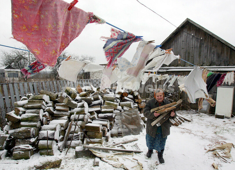 【ミンスク/ベラルーシ 1日 AFP】ロシアから隣国ベラルーシへと供給されるガスの価格の値上げ幅を巡る交渉は2006年12月31日、期限まで残り数時間と迫り、ガス供給の停止も現実味を帯びてきている。ベラルーシは、ロシアの主張する大幅な値上げ条件を緩和しなければガスパイプラインを不通にすることも有り得ると警告しており、欧州諸国へのエネルギー供給の停止も懸念されている。写真は同日、ミンスク(Minsk)から約30キロメートルのZhukovka村でまきを運ぶ女性。(c)AFP/VIKTOR DRACHEV