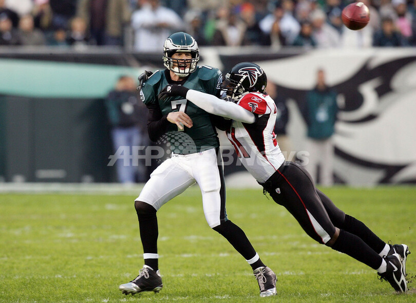 【フィラデルフィア/米国 31日 AFP】NFL・第17週、フィラデルフィア・イーグルス(Philadelphia Eagles)vsアトランタ・ファルコンズ(Atlanta Falcons)。イーグルスのQB、A・J・フィーリー(A.J. Feeley)は、3本のタッチダウンを含む33本中22本のパスを成功させ321ヤードを獲得した。試合は24-17でイーグルスが勝利し、通算成績を10勝6敗とし2季ぶりにNFC東地区での優勝を決めた。(c)AFP/Getty Images Jim McIsaac