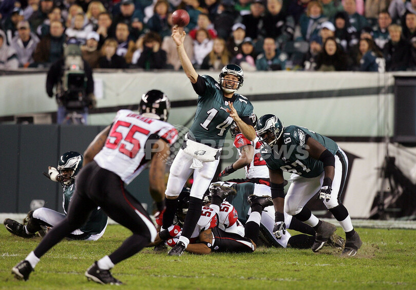 【フィラデルフィア/米国 31日 AFP】NFL・第17週、フィラデルフィア・イーグルス(Philadelphia Eagles)vsアトランタ・ファルコンズ(Atlanta Falcons)。イーグルスのQB、A・J・フィーリー(A.J. Feeley)は、3本のタッチダウンを含む33本中22本のパスを成功させ321ヤードを獲得した。試合は24-17でイーグルスが勝利し、通算成績を10勝6敗とし2季ぶりにNFC東地区での優勝を決めた。(c)AFP/Getty Images Jim McIsaac